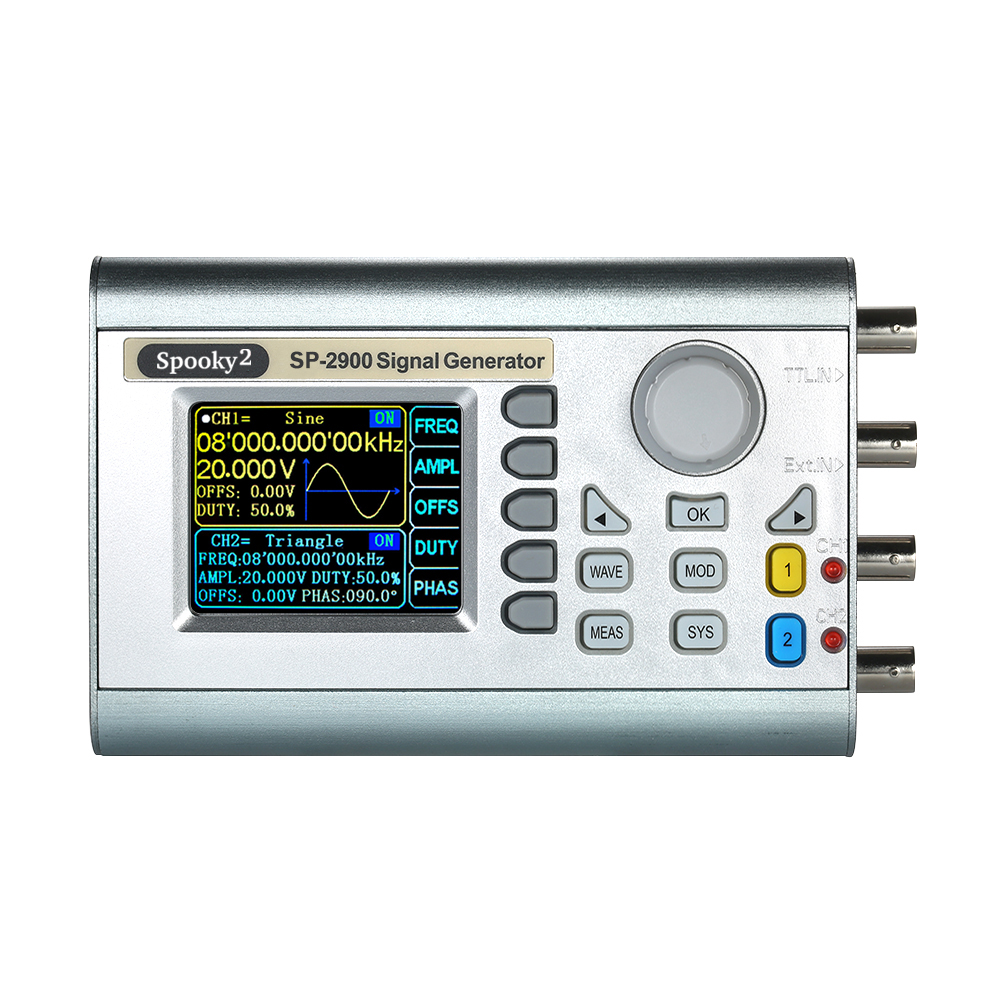 SP9080 programmable dual channel function/arbitrary waveform signal generator can generate various waveforms such as sine wave, square wave, triangle wave, pulse wave, and arbitrary wave. The frequency range of the instrument is from 1nHz to 80MHz, and it has the functions of modulation, frequency sweep, measurement signal frequency and programming, etc. It can display the output signal, amplitude, phase, duty and frequency at the same time. The instrument has excellent amplitude-frequency characteristics, multi-functions, high performance, high cost performance, portable and other characteristics providing a new choice for education, research and development, production, testing and other industries.